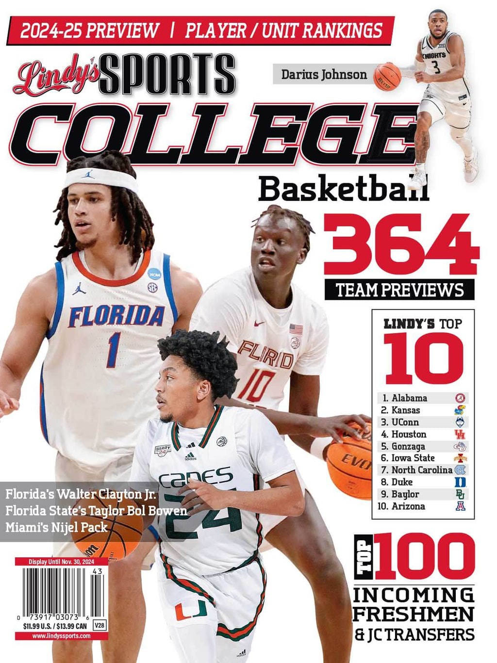 Get ready for the upcoming college basketball season with Lindy's 2025-26 College Basketball Magazine! This comprehensive magazine contains over 360 team previews, rosters, and Lindy's Top 10 rankings. But that's not all - it also features the Top 100 incoming freshmen, as well as in-depth feature stories like Scoping the Nation and National Recruiting.